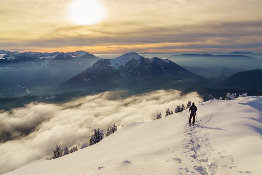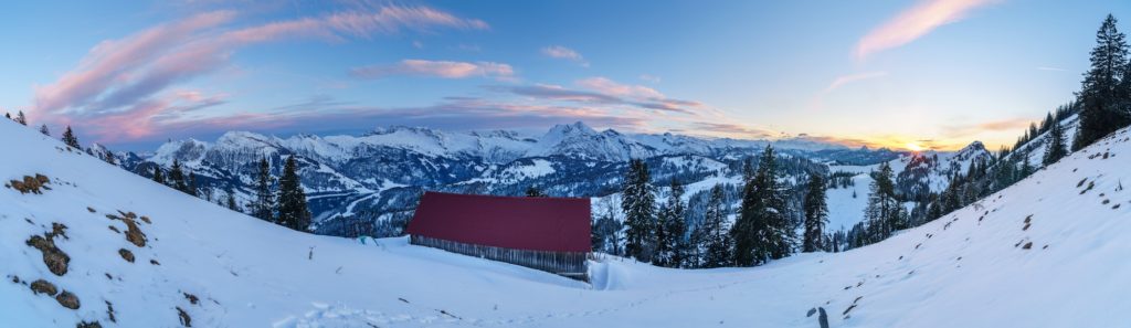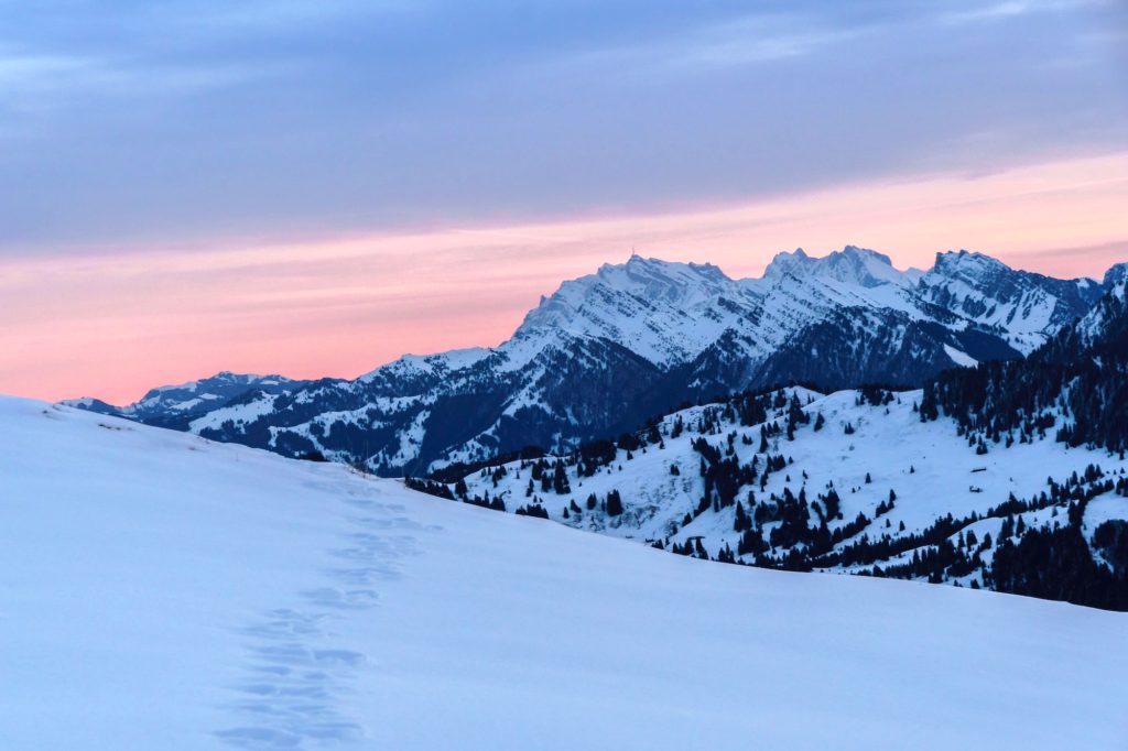 The beginning of the hiking path was a breeze to find, but that was the easy part! The first part of the climb was super steep. I had to fight for every step, my snow shoes kept slipping on stones under the snow, while I was being pulled backwards by my heavy backpack. There were so many fallen trees in the forest that there was no visible path, and with the snowfall, the signs were impossible to find. I had to turn around several times and search for a new route, and of course, ask myself if I could really manage the situation. And I was in a hurry, as all of this took more time than planned and I so didn’t want to miss the sunset! I then had to cross a river, which took up a lot of time, but then, right at sunset, as I was leaving the forest, what an incredible view I had! It made the long trek worth the effort!