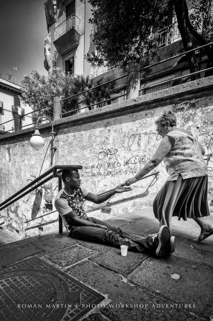 So near and so far away, both locations cause wonder and every time I find myself at these locations, they take my breath away. What that means in the aspect of a photograph and viewed with photo eyes, Naples is only one of the cities on the southern coast of Italy (by the way its one of the bigger cities in Italy). You will say it looks like Genova or some similar bigger city on the coast. For me, Naples is one of the best inspirations in street photography, an inexhaustible source for black and white photography, which makes me extremely happy because at any time of a day, whether rainy or sunny, capture opportunities are endless.